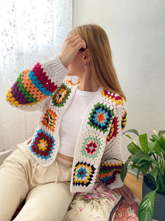Cardigan all’uncinetto fatto a mano con quadrati della nonna: corto in cotone colorato Etsy Italia