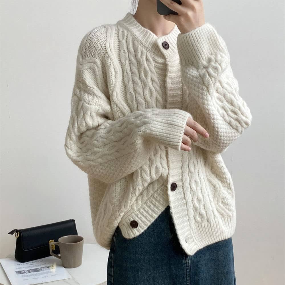 Cardigan Donna,Maglioni Da Donna Cardigan Lavorati A Maglia Cappotto Beige Vintage Trecce Jacquard Girocollo Bottone Cardigan Manica Lunga Cardigan …